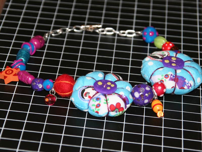Il y a donc le collier tissu et fimo Matriochkas Bleu (j’adore les poupées russes, d’ailleurs ma cuisine en est pleine, faudra que je vous montre ça un jour ) , et le collier multicoloré, réalisé avec 2 tissus différents et des perles folles : ) + breloque horloge et réglisse en fimo ( et avec de jolis boutons fimo étoilés-pailletés)