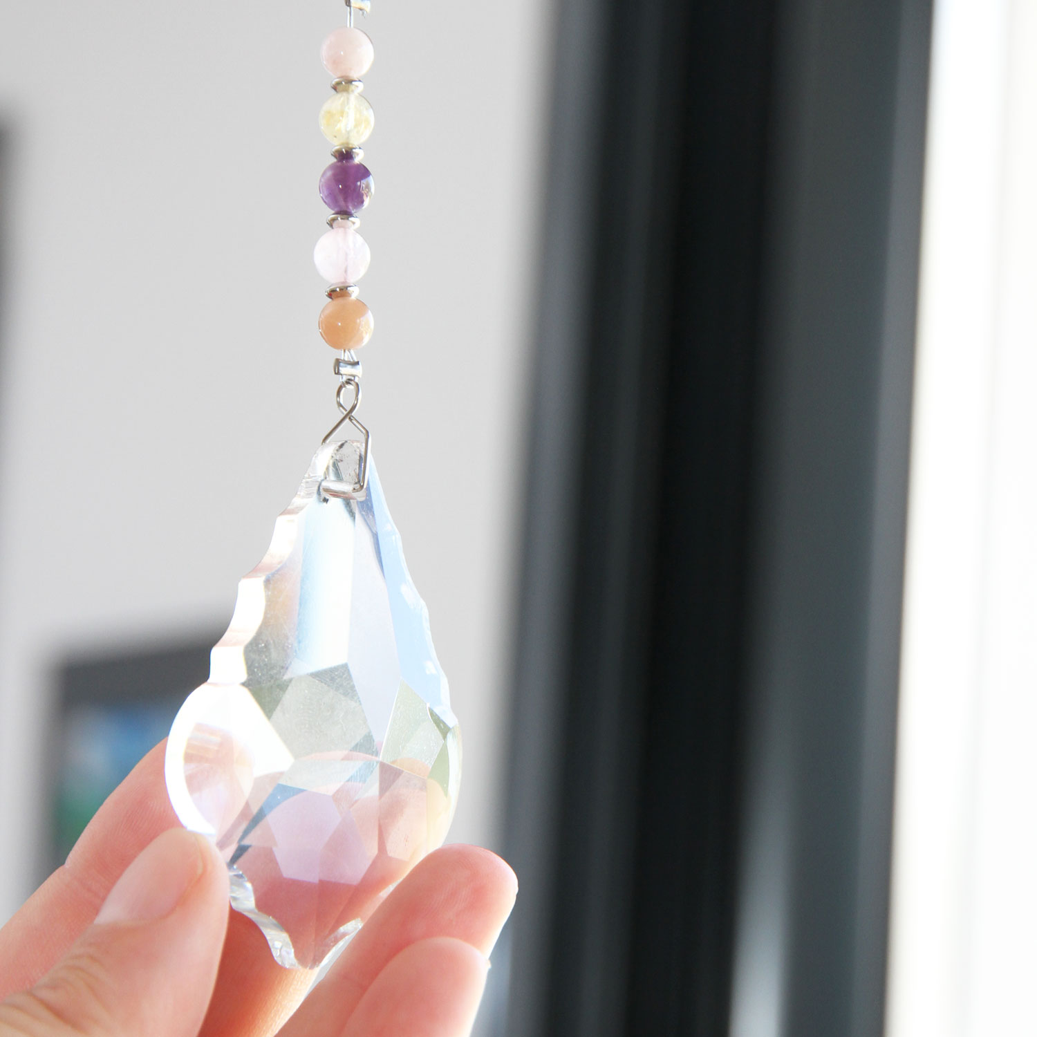 Vous pouvez consulter leurs bienfaits dans le glossaire des pierres de lithothérapie que j’ai rédigé. Je fabrique donc le suncatcher en fonction du choix de vos perles. Attention : si vous choisissez plus de 4 pierres, vous aurez un message d’erreur et ne pourrez pas ajouter l’attrape-soleil à votre panier.