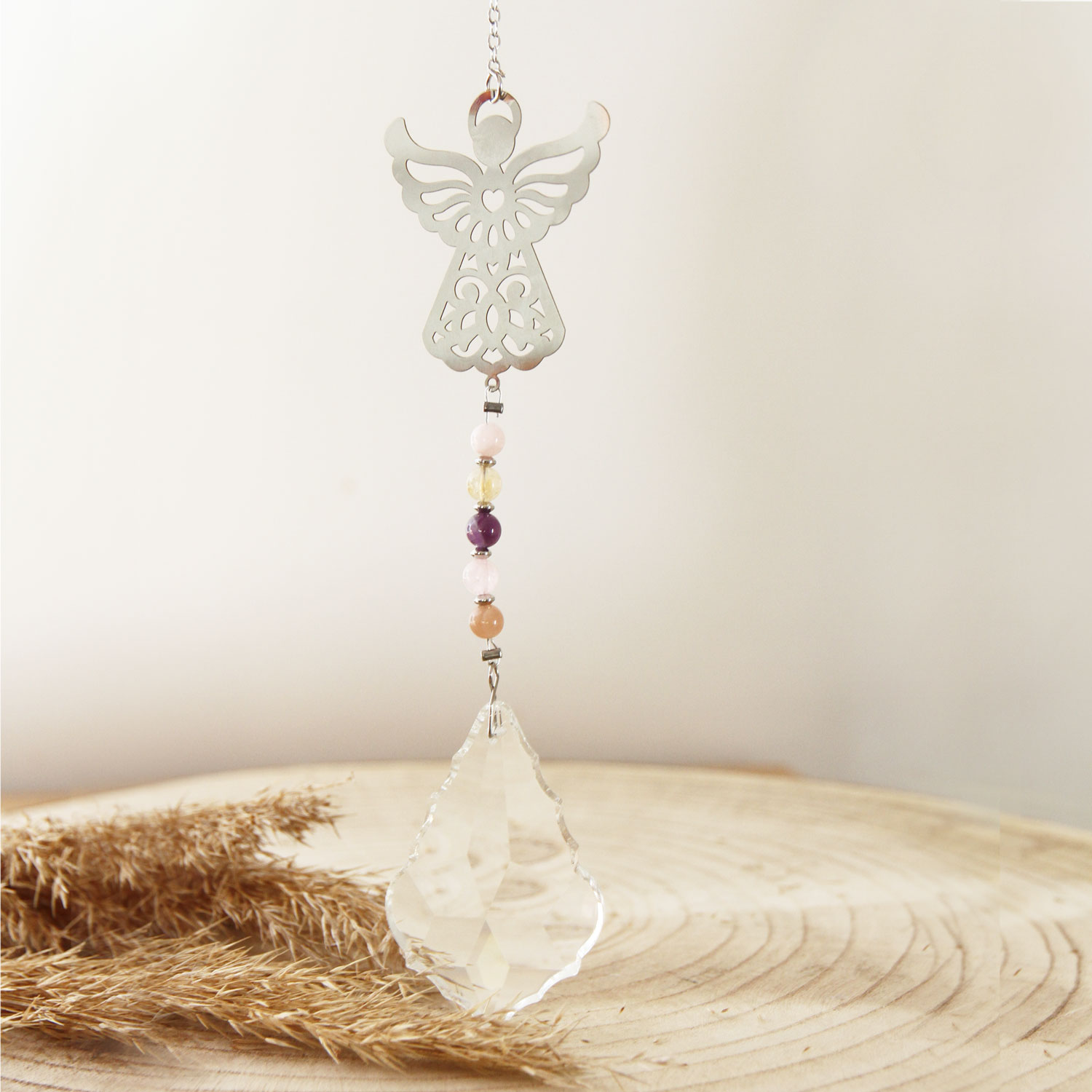 Cet attrape-soleil Ange a été pensé comme un symbole de protection, de douceur et de réconfort. Suspendu près d’une fenêtre, il capte les rayons du soleil et projette de jolis reflets qui dansent sur les murs, apportant une atmosphère paisible, presque poétique.