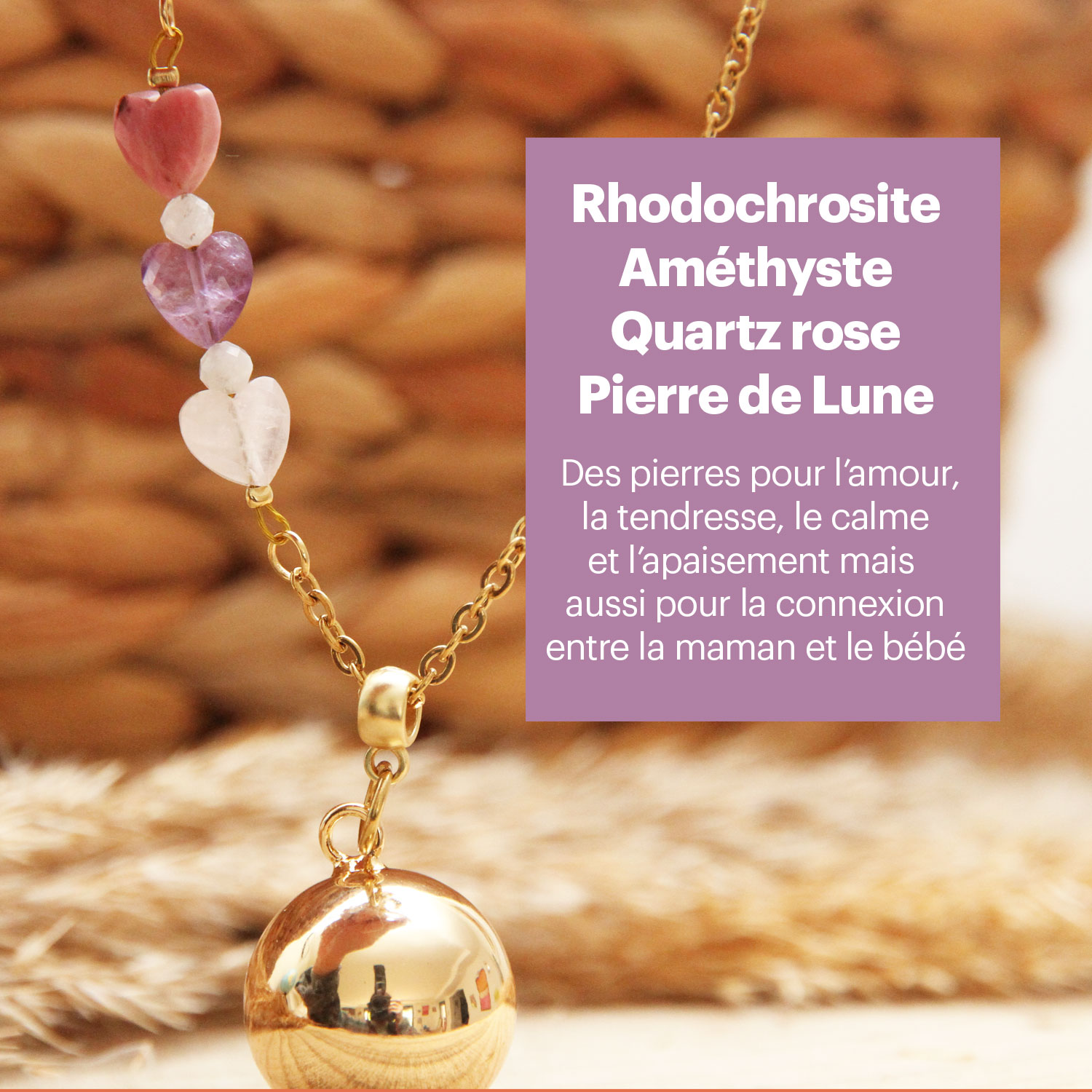 🩷Découvrez le bola de grossesse lithothérapie « Amour & Sérénité », réalisé avec des pierres naturelles en forme de coeur : Quartz rose, Améthyste et rhodochrosite + 2 perles 4mm Pierre de Lune. Un bola pour 9 mois apaisés grâce à l’énergie des pierres : )
