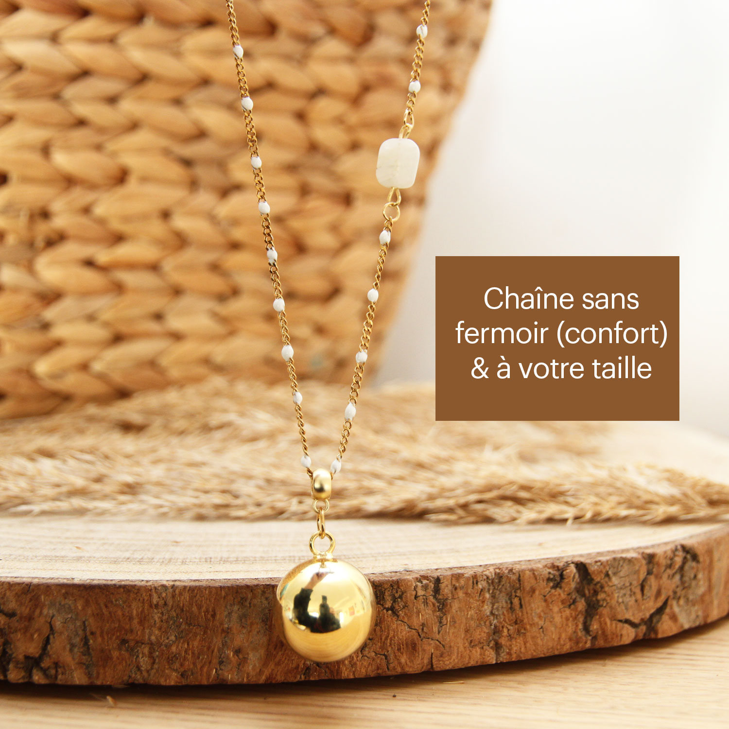 Ce bola est monté sur une chaîne en acier inoxydable doré perlée, agrémentée de perles en résine blanche  et d’une perle naturelle rectangulaire facettée en pierre de lune blanche (10×4 mm), délicatement placée sur le côté de la chaîne.