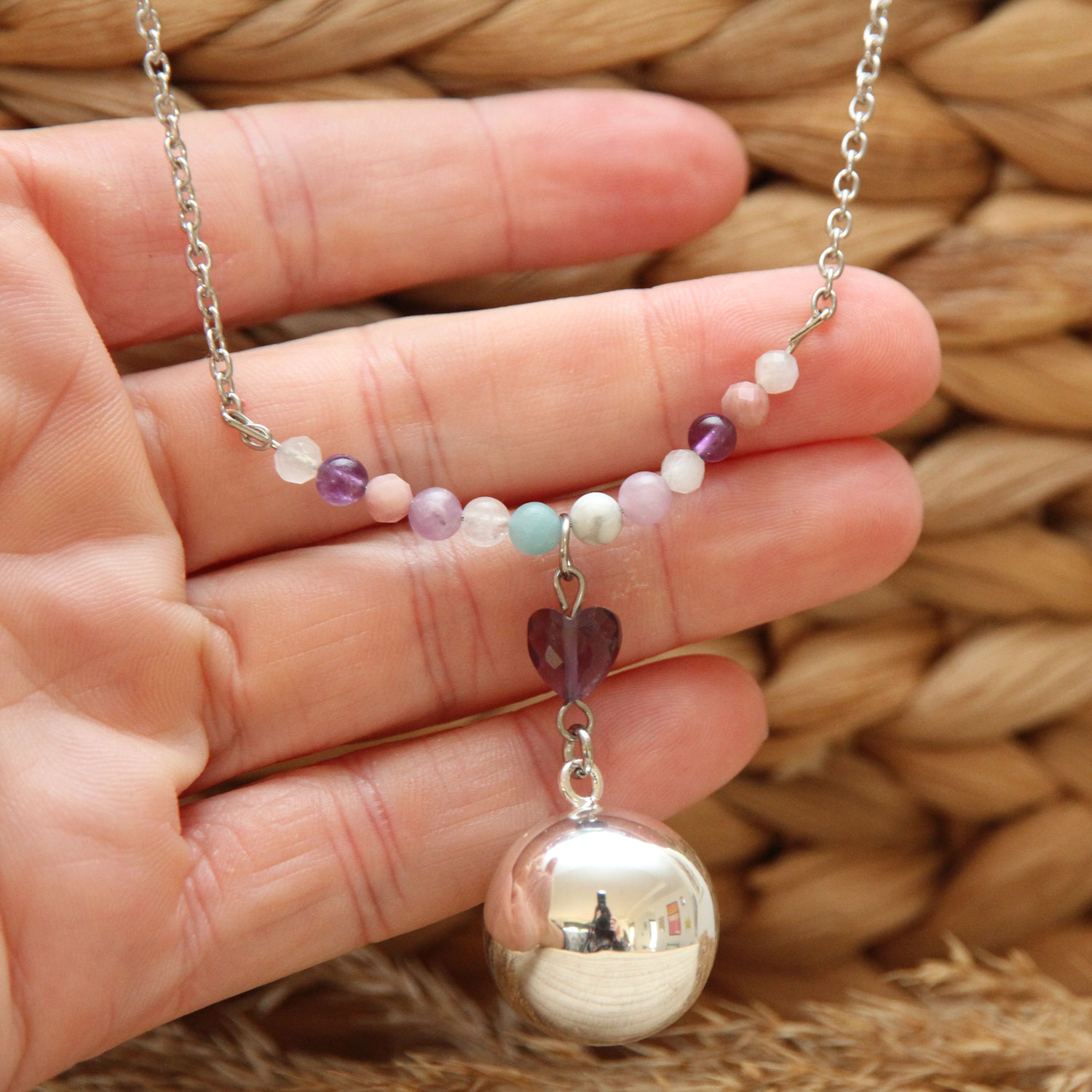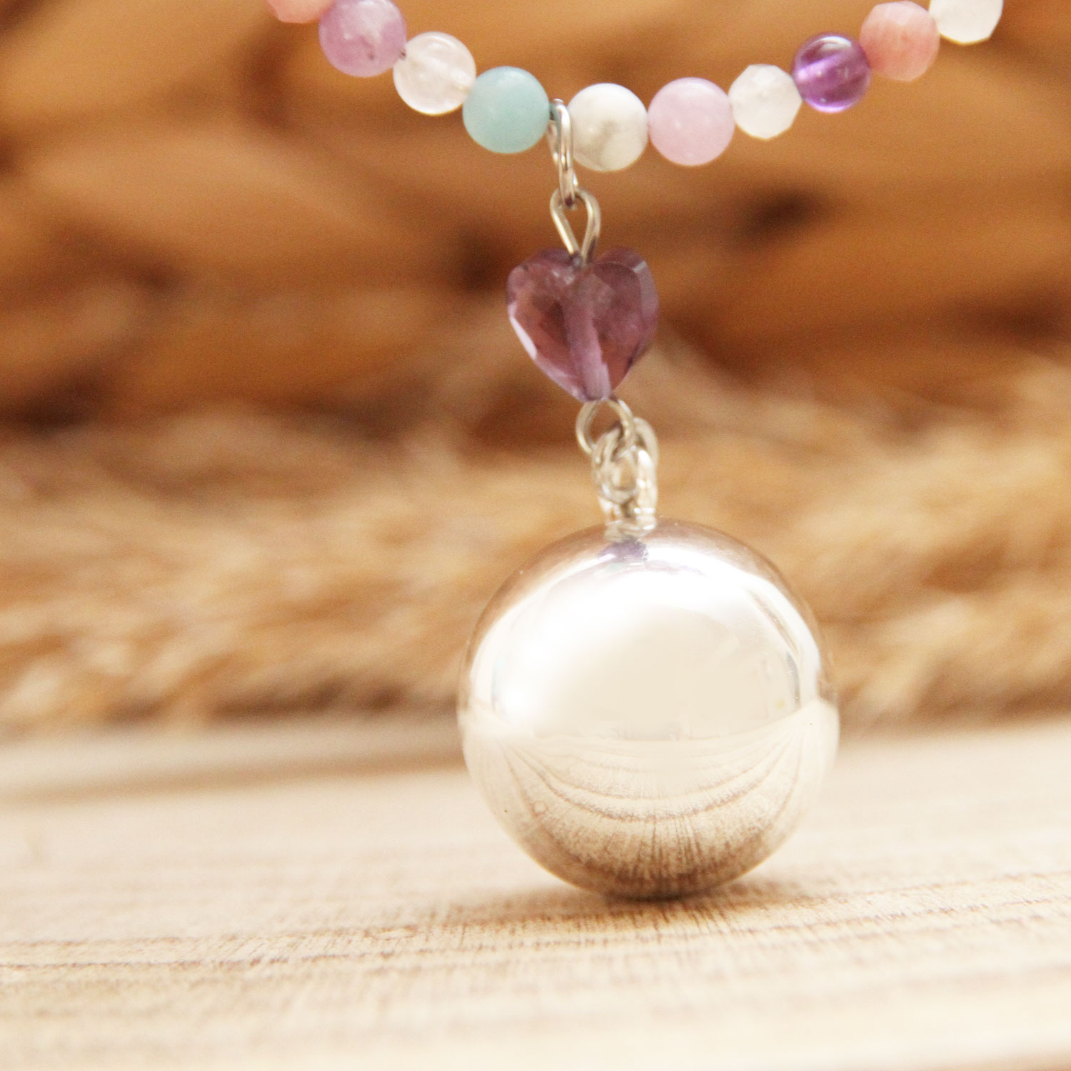 un Bola de Grossesse Mini Cœur Améthyste, personnalisable avec 12 petites pierres naturelles.