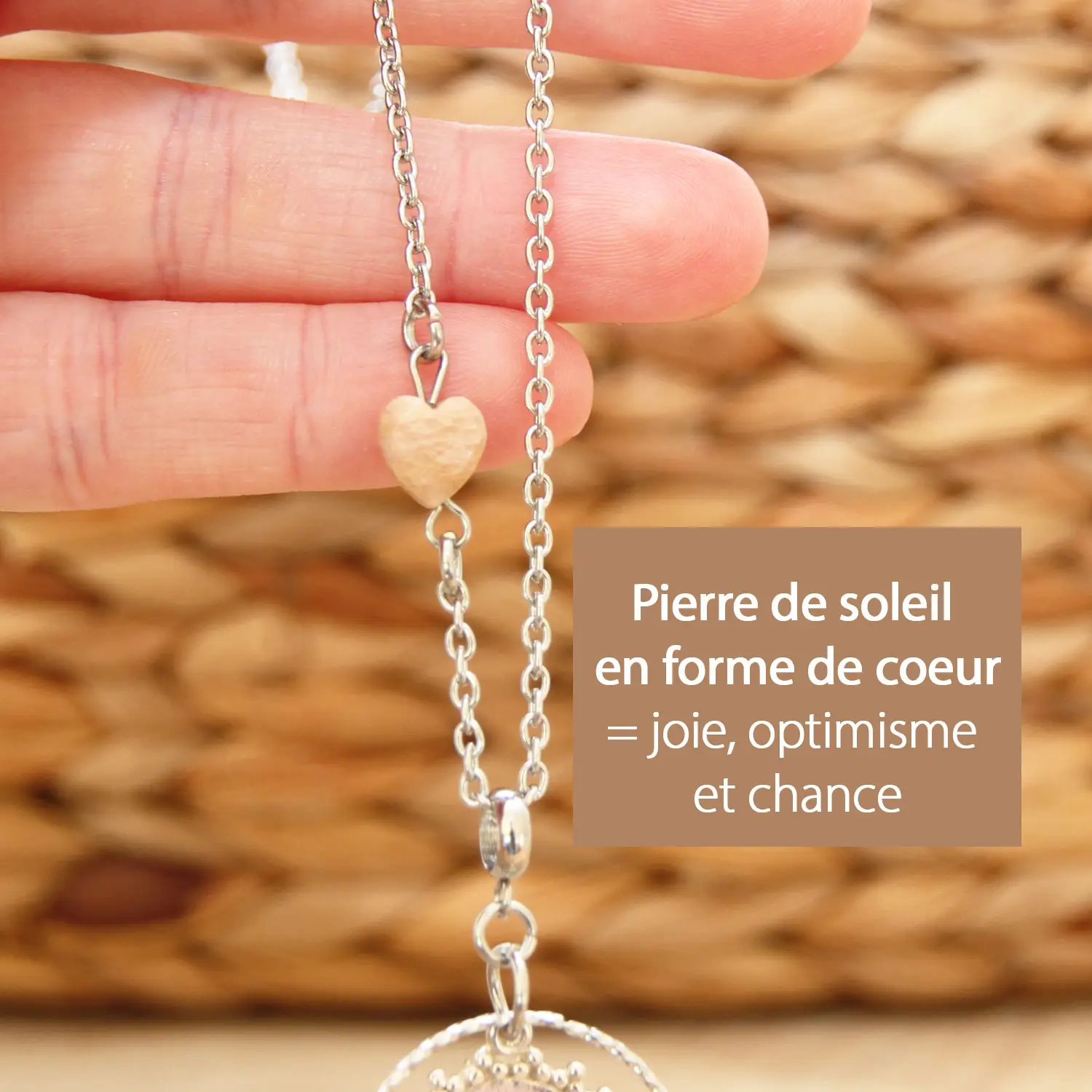 • Une perle cœur en pierre de soleil (8 mm), symbole de lumière et de joie