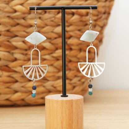 J’ai imaginé ces boucles d’oreilles très graphiques, modernes et aériennes, avec une structure qui rappelle un éventail solaire souligné par des petites pierres bleues en cascade. Elles sont composées d’aigue marine, de lapis lazuli et d’apatite, des pierres bleues associées au chakra de la gorge.