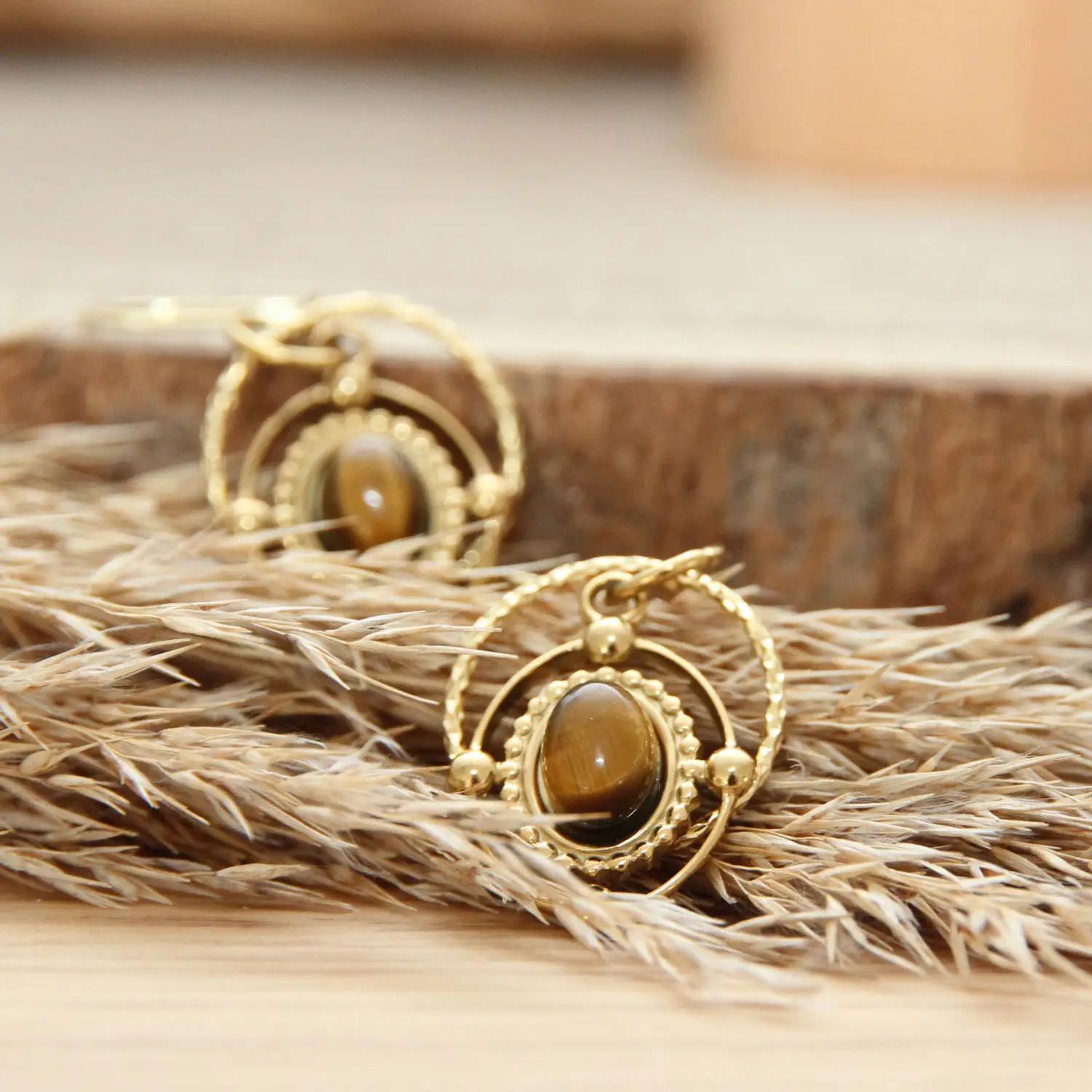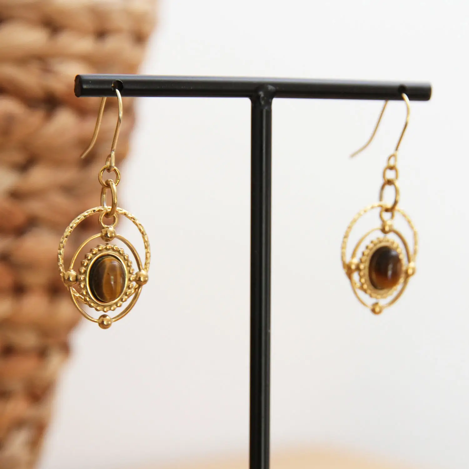 Des boucles d’oreilles lithothérapie en oeil de tigre