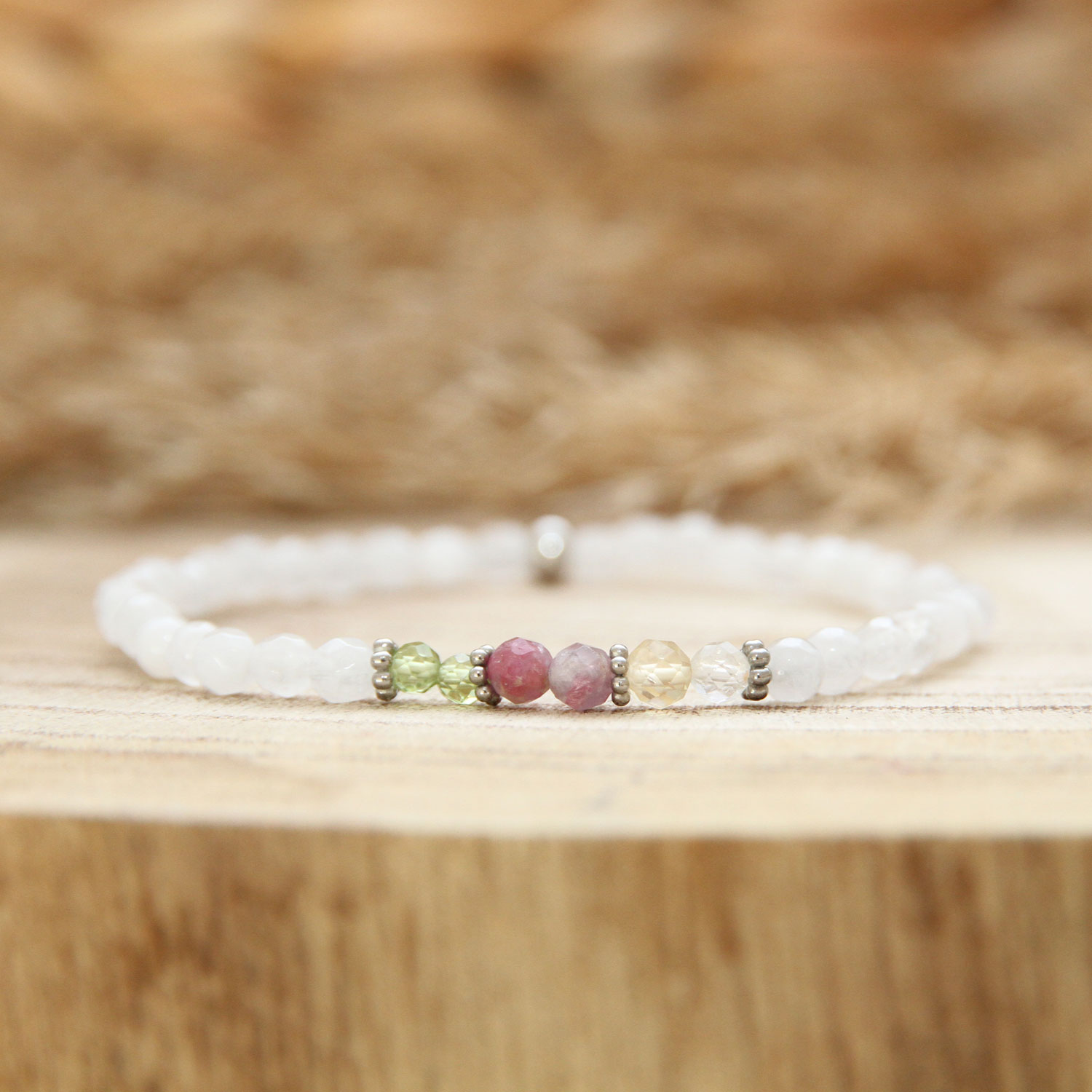 Le bracelet est composé de pierres fines de taille 4mm. Vous pouvez choisir de 1 à 10 pierres différentes dans le formulaire de personnalisation.