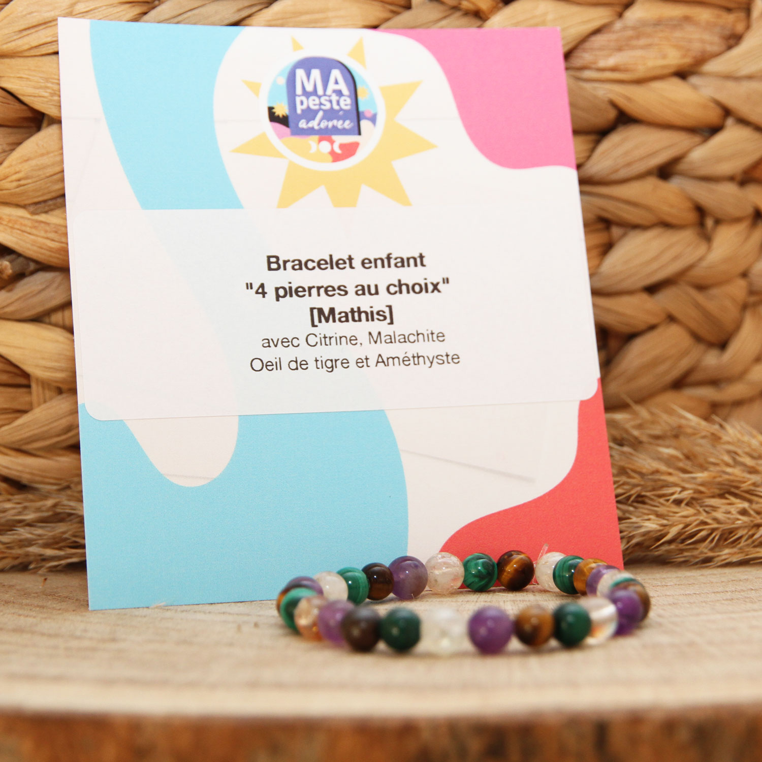 Bracelet monté sur élastique ou fil rigide, pour Enfants « 4 pierres au choix », réalisé en Pierres Naturelles de lithothérapie 6mm. Le principe : vous choisissez en bas de fiche la composition de votre bracelet, plus de 50 pierres sont proposées !