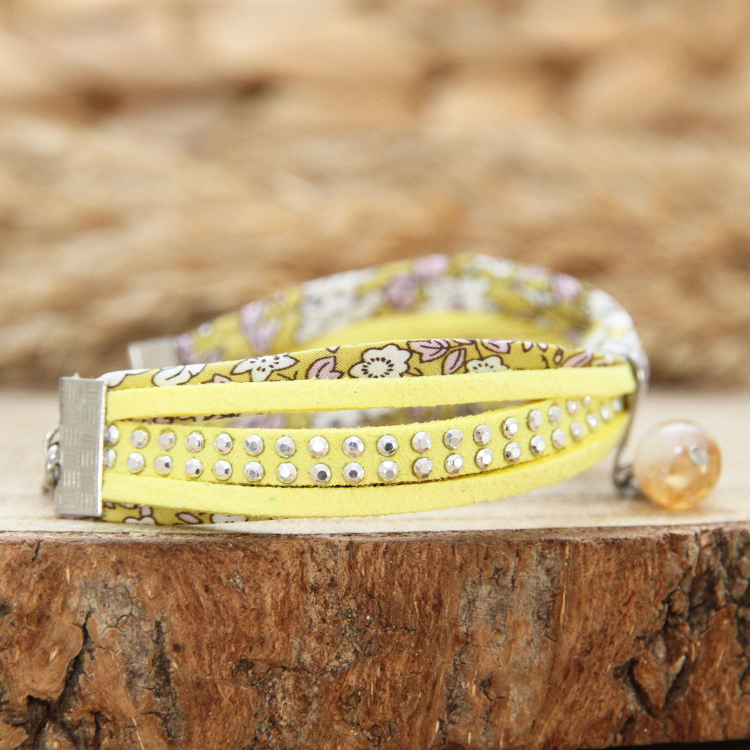 Le bracelet en Liberty « Rayon de Joie » est une création Liberty & Lithothérapie, une explosion de lumière et de bonne humeur ☀️Réalisé à la main avec ses jolis cordons Liberty Daisy Daisy et suédine ensoleillée, il s’illumine d’une perle naturelle de citrine, symbole d’énergie et de bonheur. Parfait pour les petites filles pétillantes !