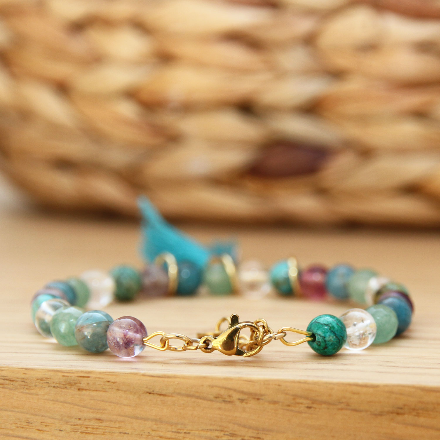 Ce bracelet en pierres naturelles de lithothérapie est composé de 5 pierres différentes, de taille 6mm. Cette synergie de pierres semi-précieuses a été spécialement choisie pour accompagner les enfants qui ont des troubles cognitifs ( troubles de l’apprentissage, de l’attention, troubles DYS, TDA ou TDAH)