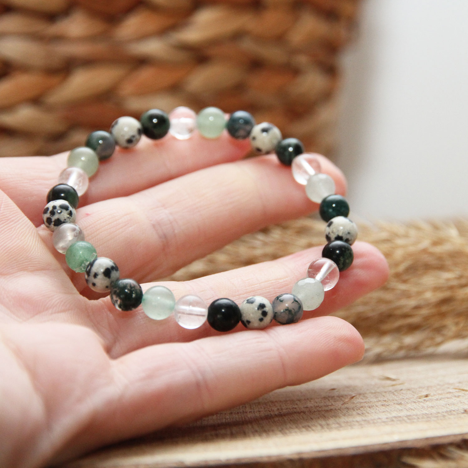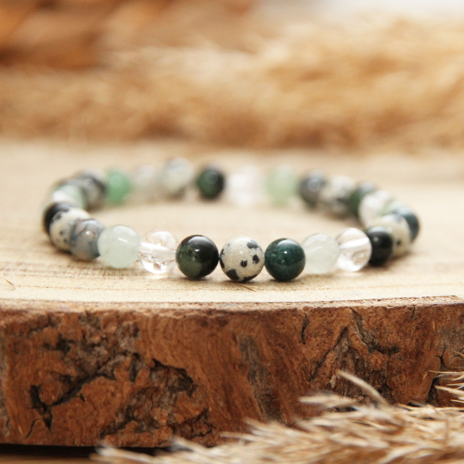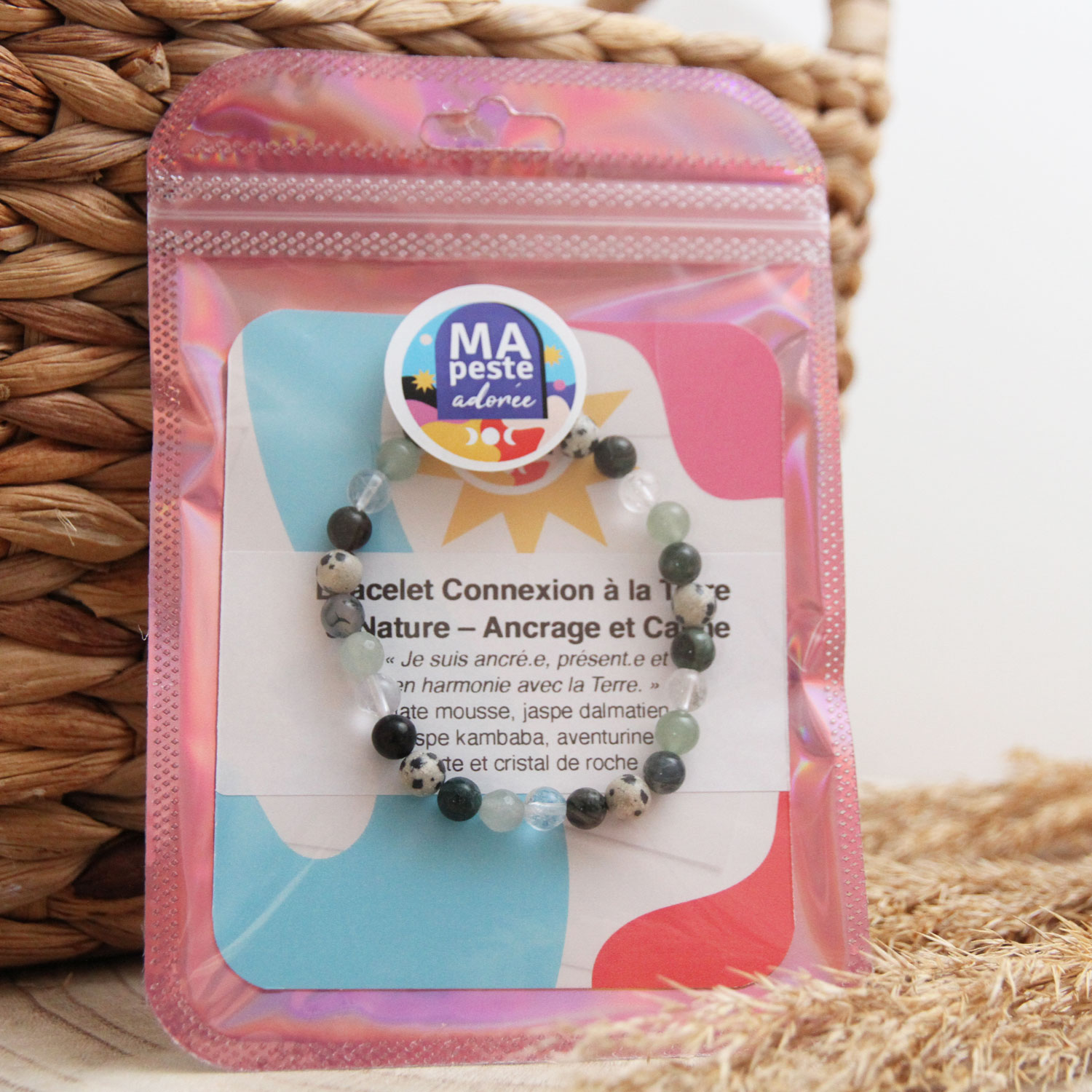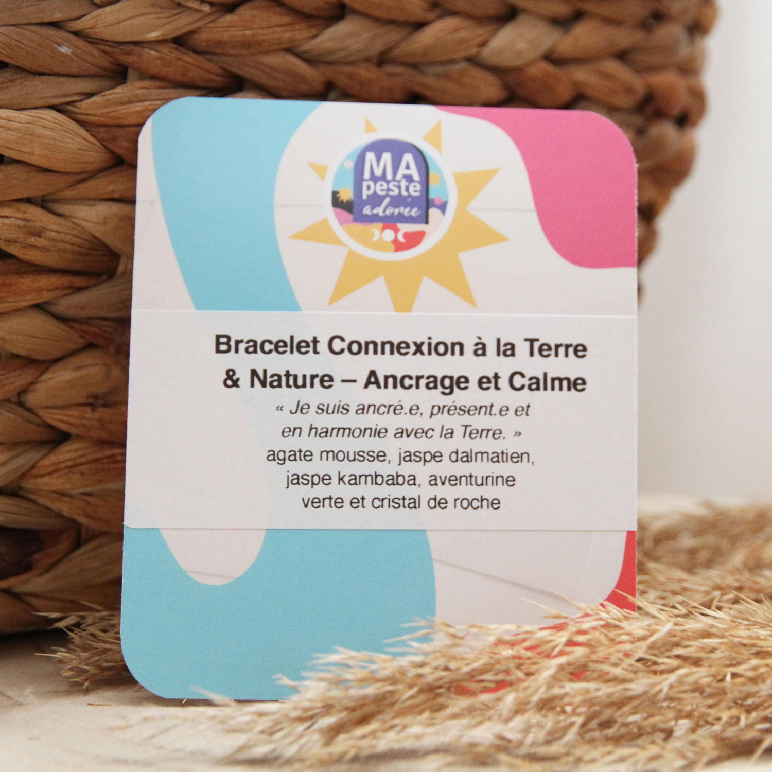 Ce bracelet “Connexion à la Terre & Nature” est composé de pierres douces et rassurantes :