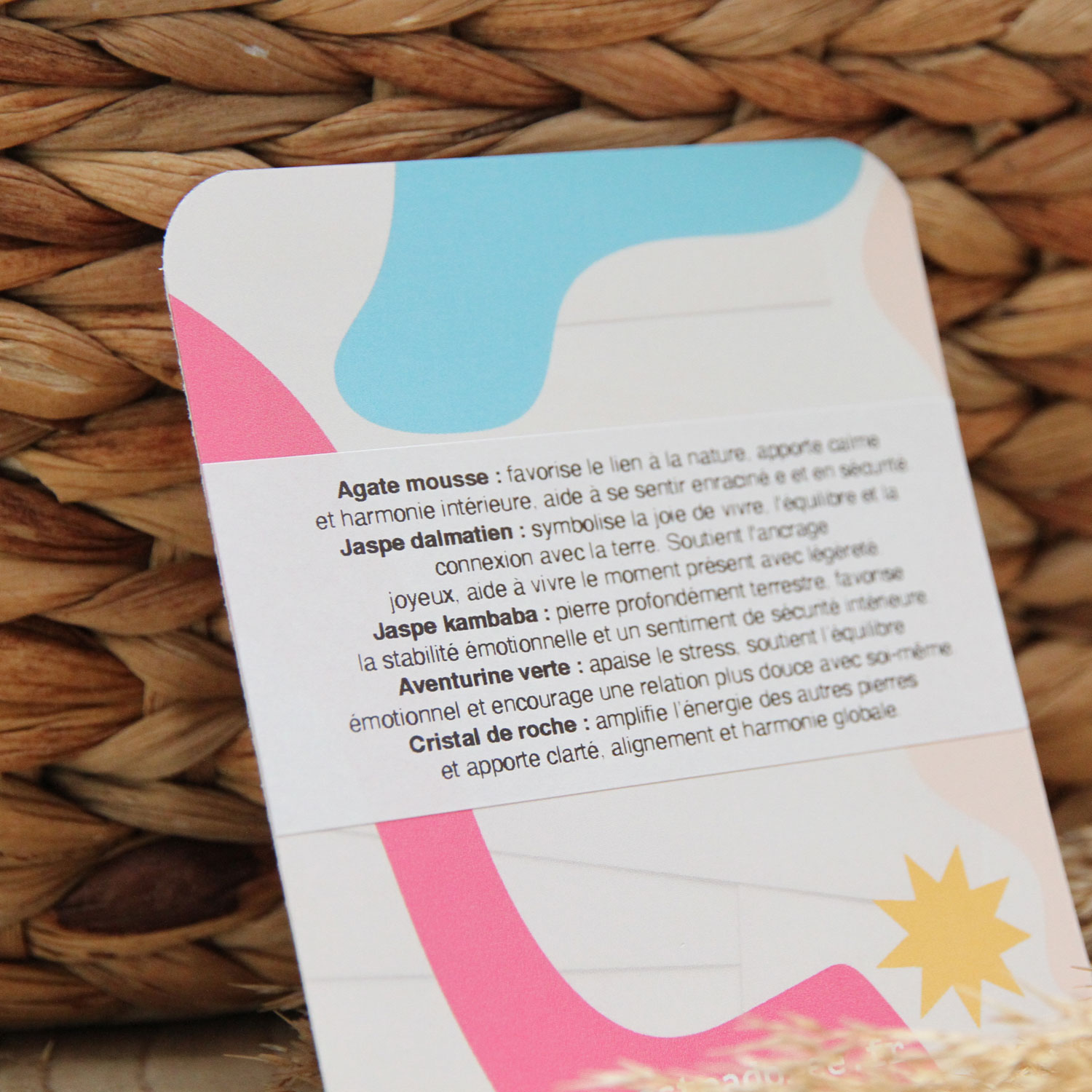Carte personnalisée : fournie avec la liste des pierres et leurs bienfaits émotionnels, expliqués simplement.