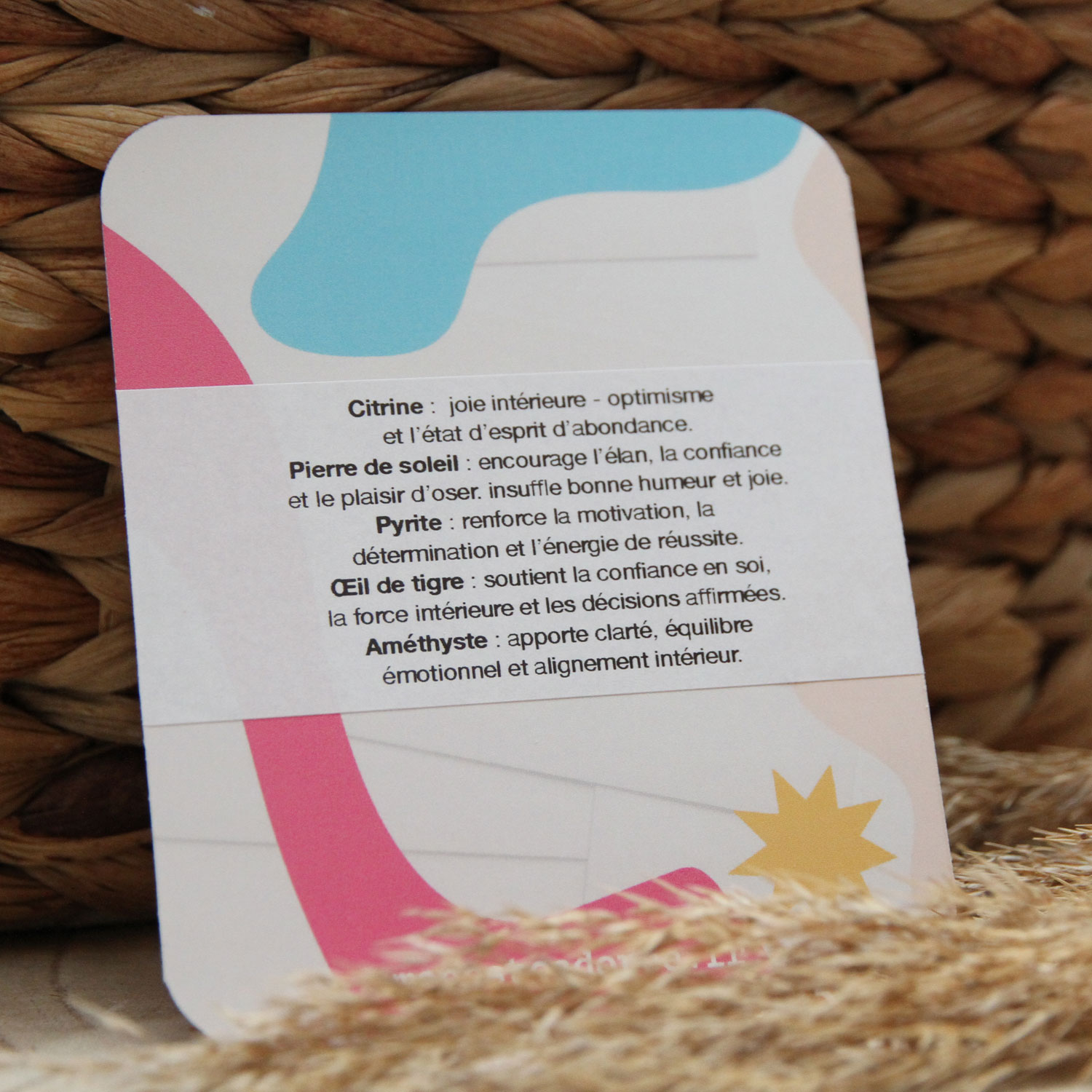 • Carte personnalisée : fournie avec la liste des pierres utilisées et leurs bienfaits émotionnels.