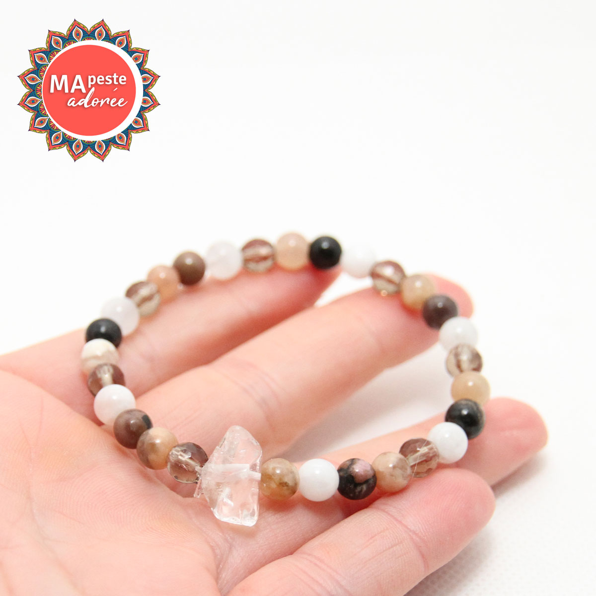 Les perles naturelles de ce bracelets sont de taille 6mm, et j’ai ajouté un cristal de roche brut au centre, la taille est variable.