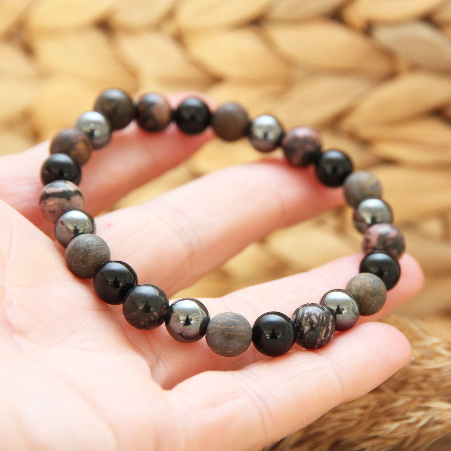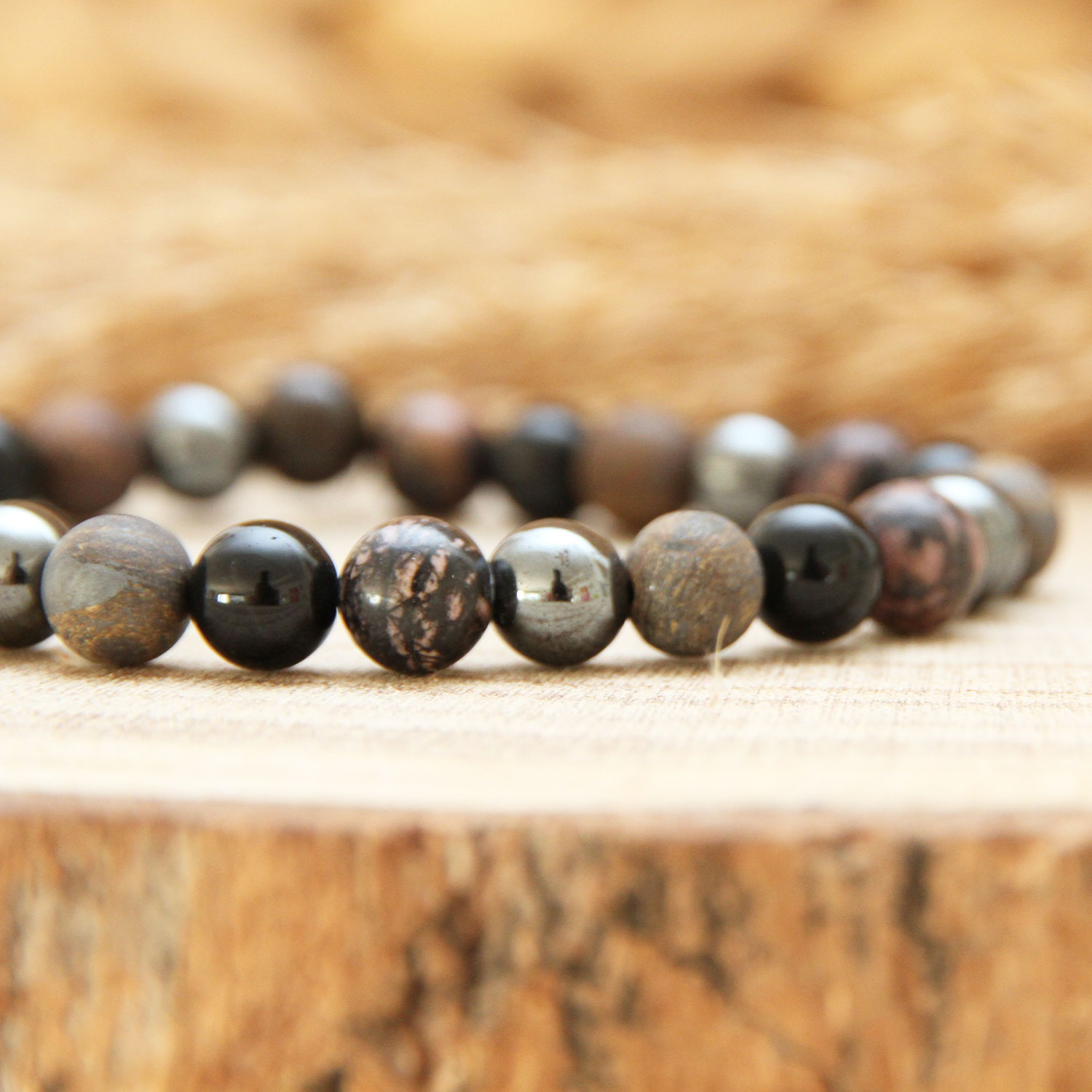 Perles naturelles : 8 mm en rhodonite, bronzite, hématite et obsidienne noire.