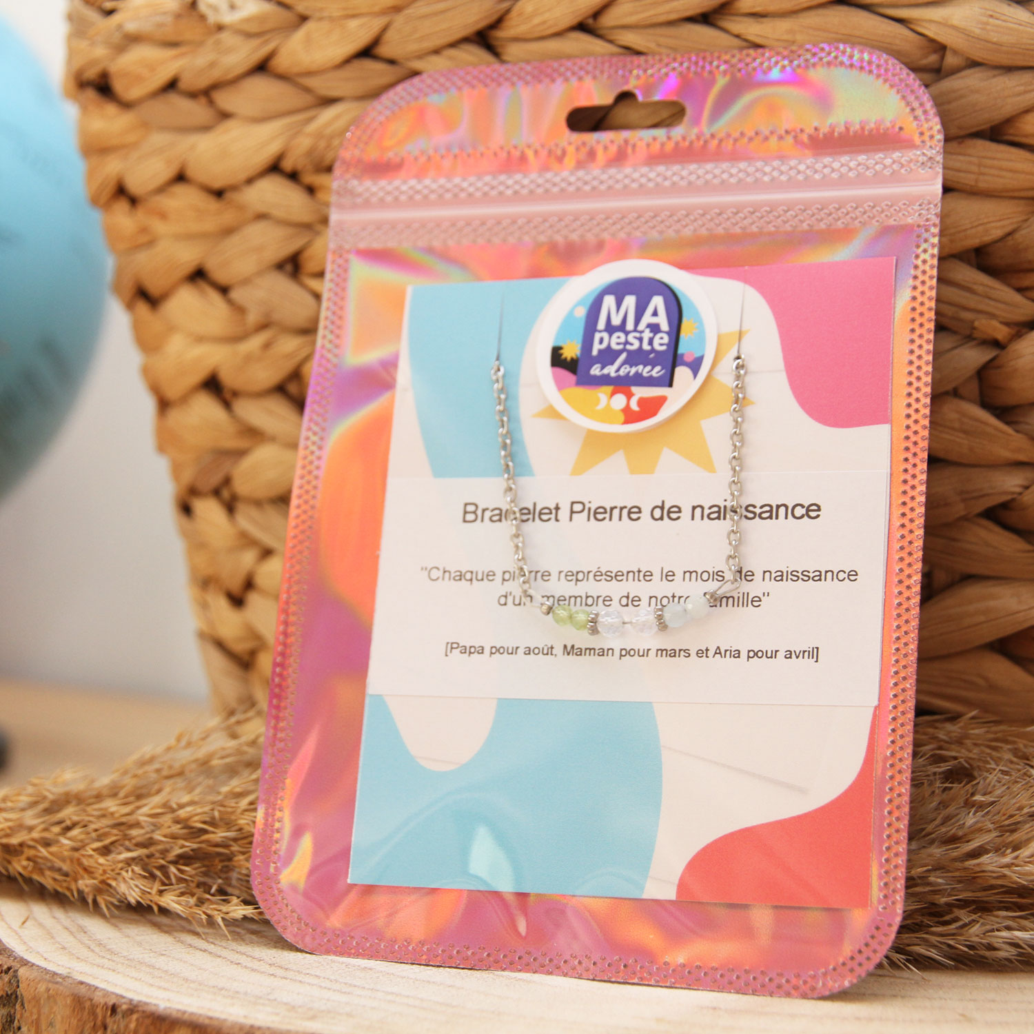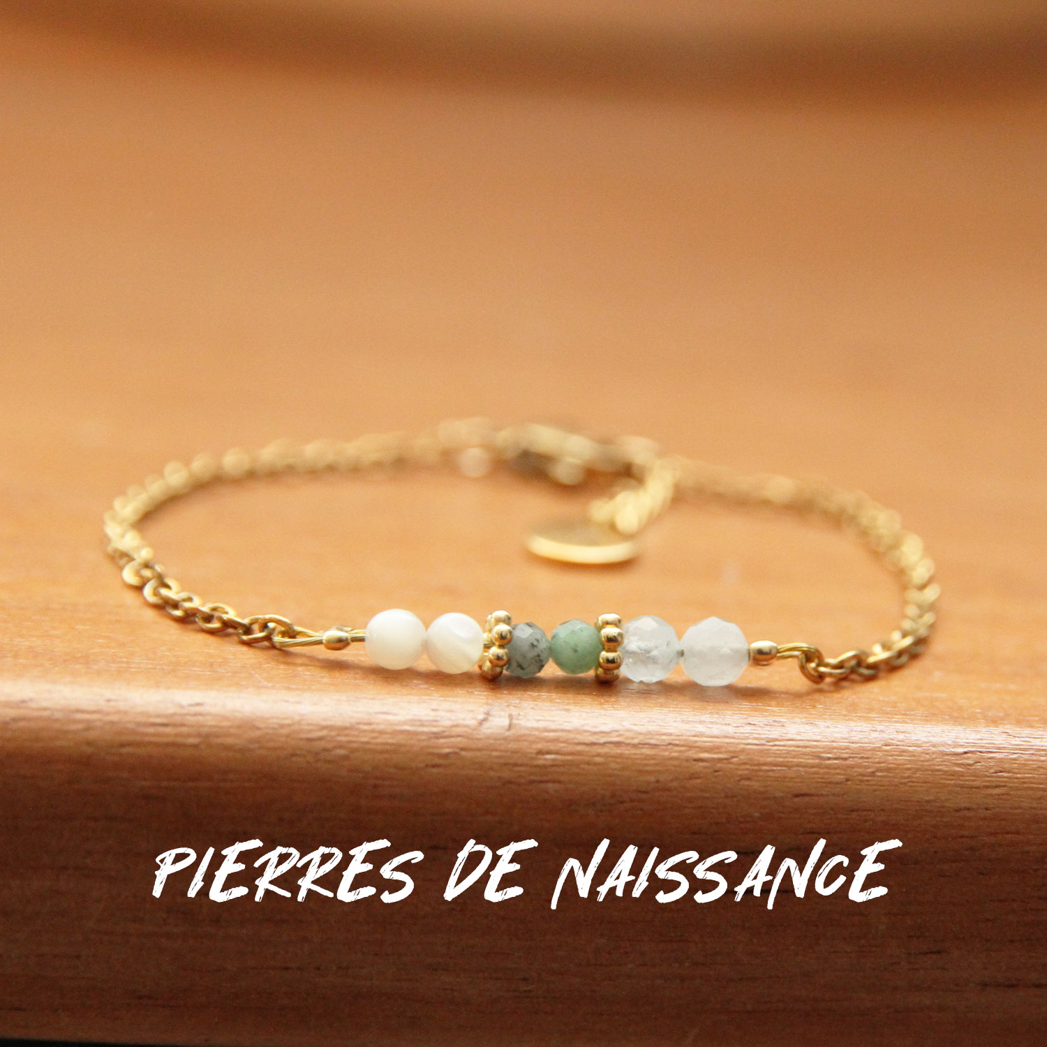 Le bracelet lithothérapie « Pierre de naissance » monté sur une chaîne est un bracelet avec des pierres naturelles qui symbolisent votre mois de naissance ou alors les mois de naissance de chaque membre de la famille. Vous pouvez composer le bracelet pierre de naissance de votre famille avec de 1 à 10 pierres naturelles. Les pierres utilisées sont des pierres de 3-4mm à facettes. De nombreuses options de personnalisation vous permettront également de rendre ce bijou encore plus unique.