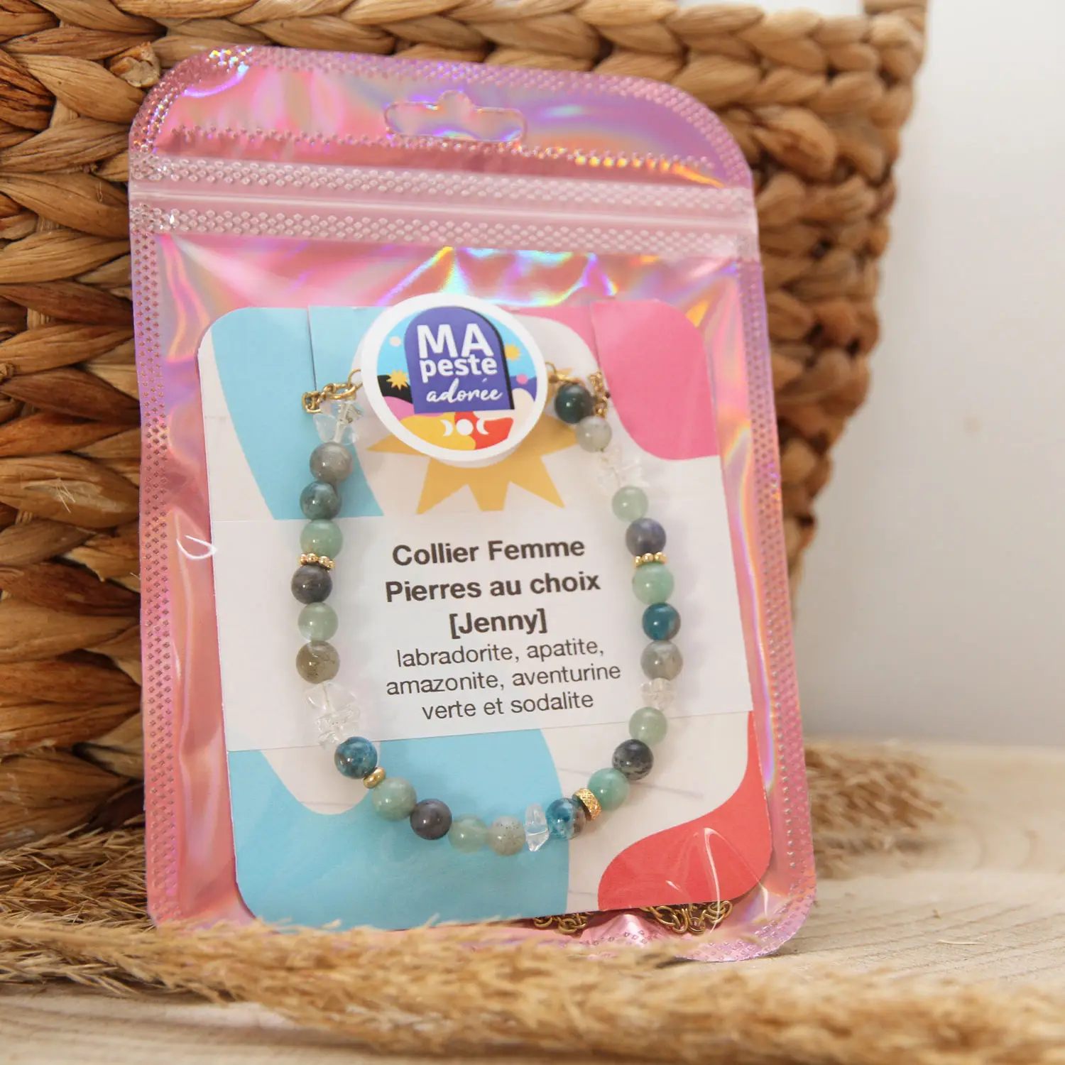 Chaque collier de lithothérapie est unique et est livré avec une petite carte qui reprend les pierres utilisées.