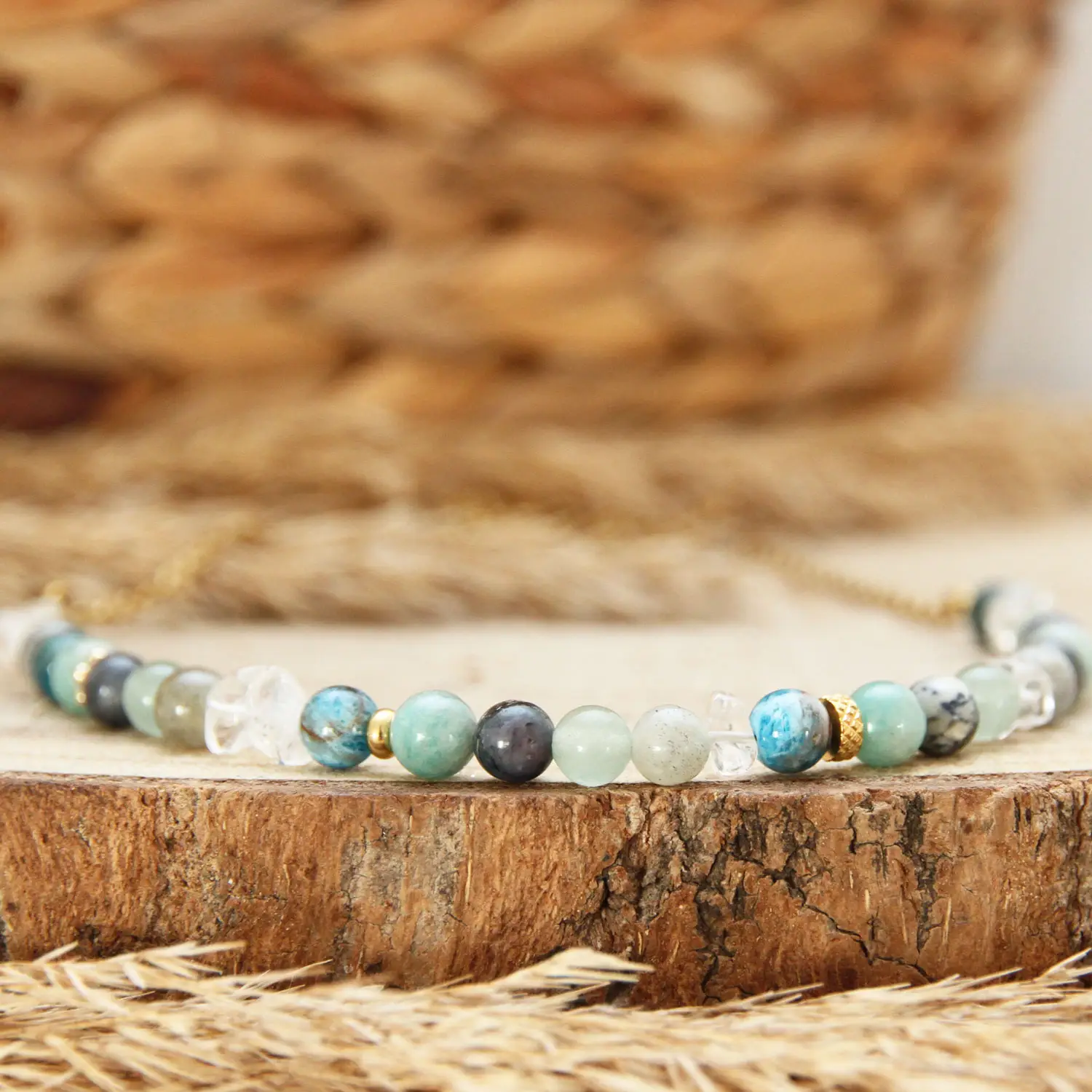 Le rendu original de ce collier tient aux formes différentes des perles choisies. Si les formes que j’ai à l’atelier sont trop identiques, je me réserve le droit d’ajouter quelques chips de cristal de roche (le cristal de roche est une pierre qui booste l’énergie des autres pierres).