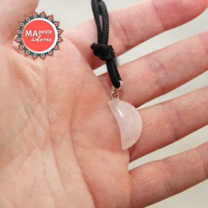Voici un collier pour enfant ou adulte, avec un pendentif en forme de Lune en pierre de Quartz rose de 2cm.