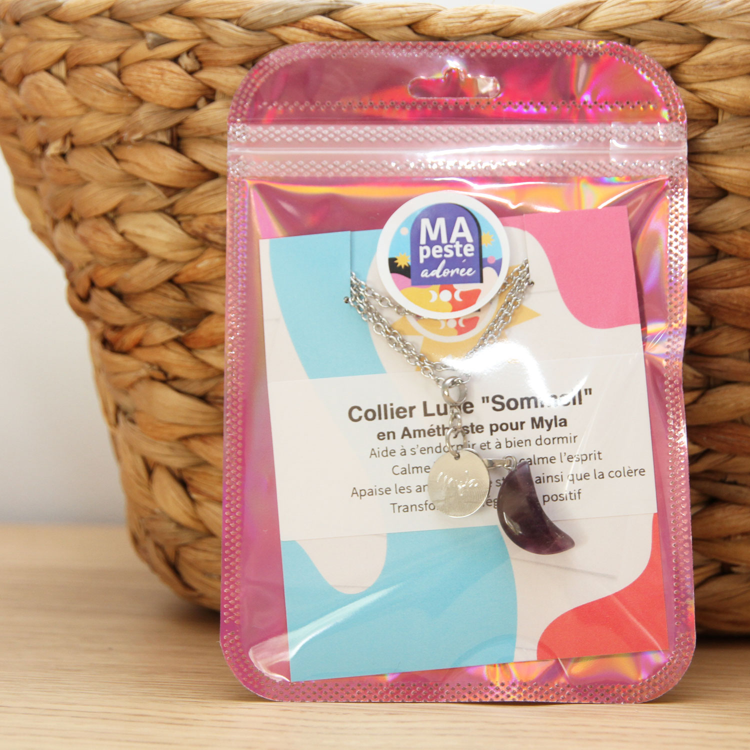 C’est un collier qui peut être discret, avec simplement un cordon suédine et le pendentif Lune en améthyste violette. Il peut également être plus original et coloré, avec un cordon en Liberty et des options supplémentaires (médaille, breloque, pompon) A vous de voir !