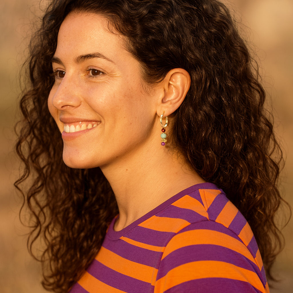 Une fois la couleur de votre paire de créoles choisie, vous pouvez choisir entre 5 synergies (association) différentes. Chaque créole est composée de 4 pierres, de tailles et formes différentes, assemblés sur une tige en acier inoxydable. De bas en haut : perle 3-4mm – Chips – perle à facette 7mm – perle 3-4mm