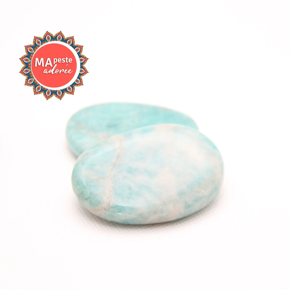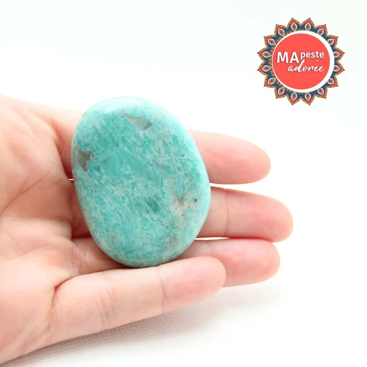 Voici un galet plat d’amazonite : il a une taille parfaite pour le garder dans sa poche, dans un sac, un cartable ou dans une chambre (sur une commode, une table de chevet). Il n’est ni trop grand, ni trop petit, pour un enfant ou un adulte. Juste la taille idéale pour profiter de ses bienfaits.