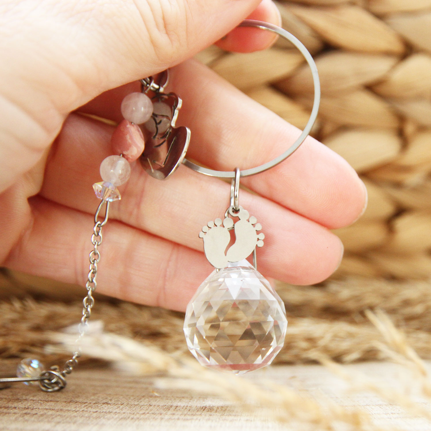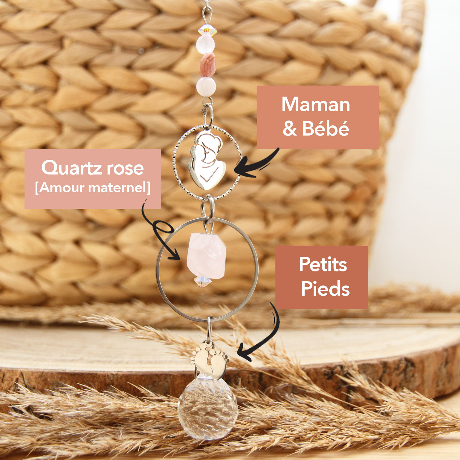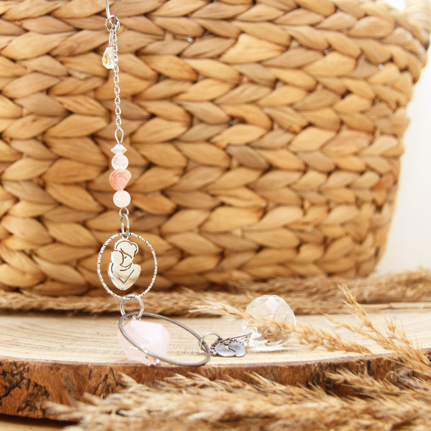 Ce suncatcher a été pensé comme un refuge lumineux pour la maman et son bébé, une invitation douce à ralentir, respirer et savourer les premiers instants de cette nouvelle vie. Suspendu dans la chambre, il diffuse une lumière rassurante et une énergie tendre, comme un cocon protecteur autour du duo maman–bébé. Chaque pierre a été choisie pour accompagner le lien, apaiser les émotions et envelopper l’espace de bienveillance.