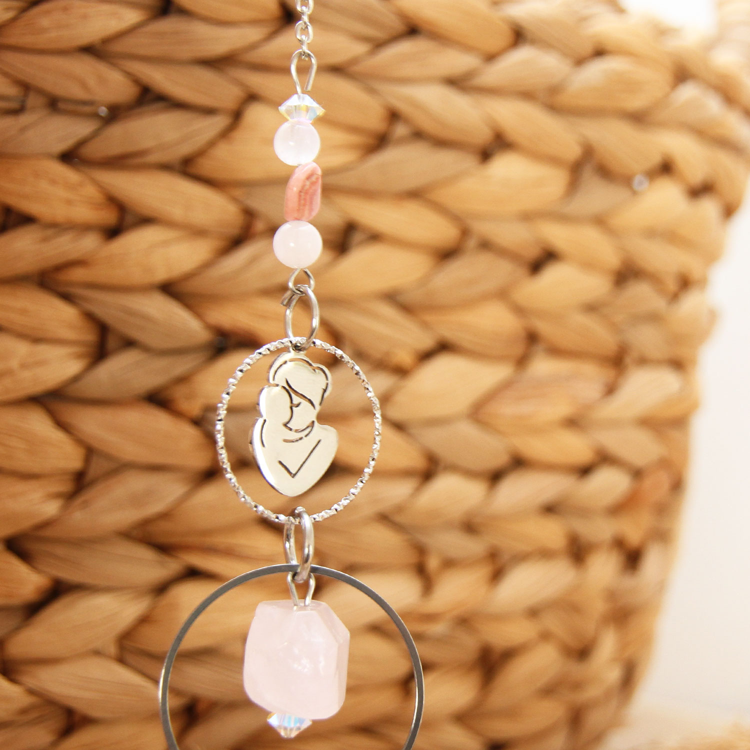 Découvrez ce joli attrape soleil réalisé à la main en acier inoxydable et pierres naturelles liées au chakra du coeur. Ce modèle à été imaginé comme un cadeau de naissance à offrir à une maman et à son bébé, pour faire entrer la lumière dans la chambre de ce petit humain tout neuf … mais vous pouvez très bien vous l’offrir si vous êtes une future ou nouvelle maman <3