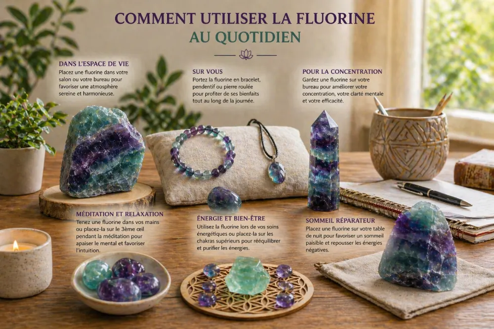 La fluorine est une pierre remarquablement facile à intégrer dans le quotidien, que ce soit par la lithothérapie formelle ou simplement par sa présence esthétique.