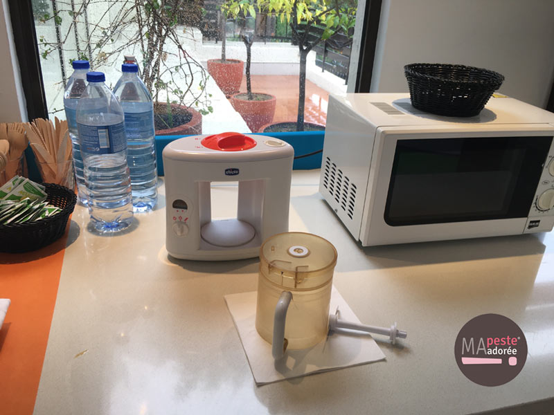 biberonnerie qui se trouve à plusieurs endroits dans les couloirs du club : c’est une pièce accessible 24h/24 avec à disposition yaourts standards et yaourts au soja, compotes de fruits, lait de vache et lait végétal, biscuits, pots bébé, kiri… Et puis aussi un micro-ondes, un stérilisateur, un évier avec goupillon et liquide vaisselle. Vraiment, la pièce super géniale quand on a un bébé qui peut avoir faim à toute heure !